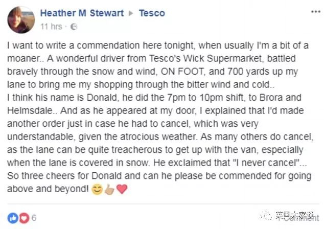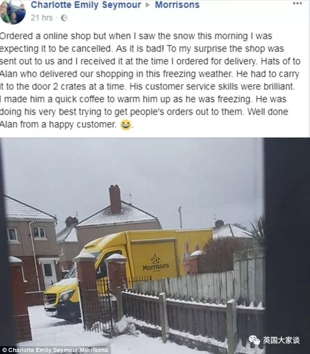 一名市民在推特上写:我看今天这大雪以为超市会暂停送货上门,但我居然收到了货物,我太吃惊了。感激那个叫Alan的送货员。