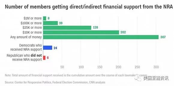 根据CNN新闻最新统计,目前美国国会两院的535名成员中,有307人要么直接从步枪协会及其附属机构处获得过竞选资金,要么就是从协会的广告活动中受益。