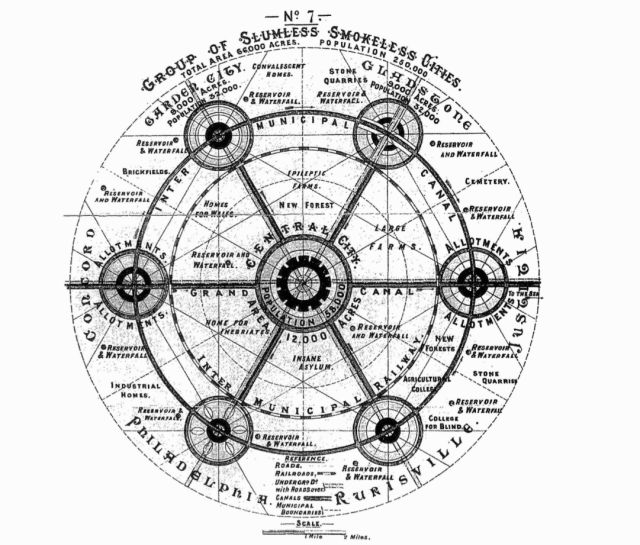与考夫曼不同,另一位规划师盖迪斯在设计的时候考虑到了城市土地的扩张。在城市道路的规划上,他参照田园城市建设和卫星城建设的理论,通过改变城市道路结构的方式预防可能出现的大城市病。
