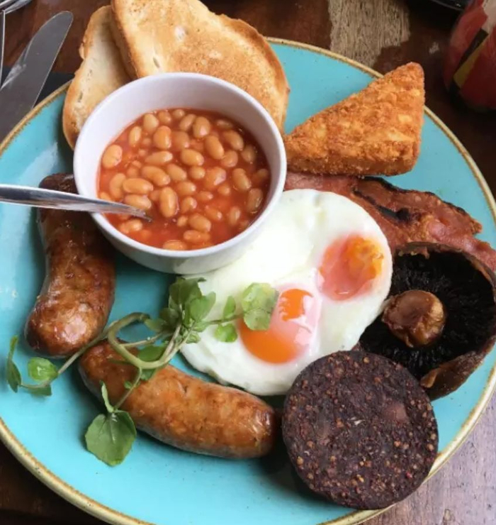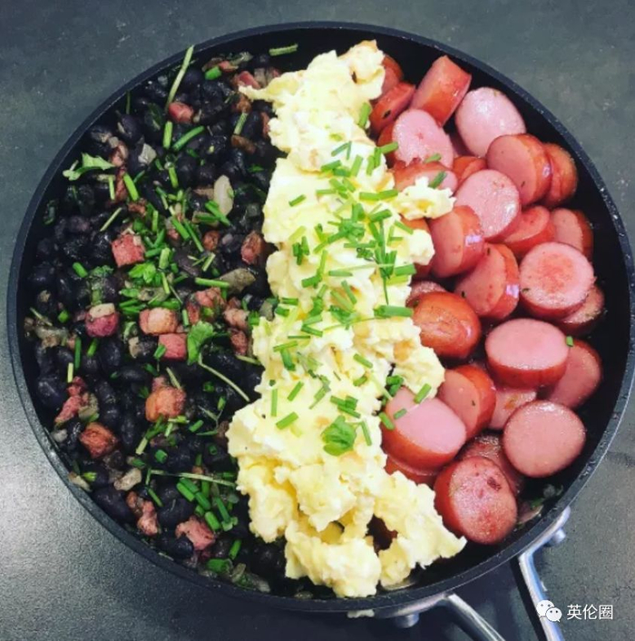 完美的英式早餐也是啥都有,颜值也不低:基本由鸡蛋,吐司,豆类,香肠和黑布丁(血肠)组成。