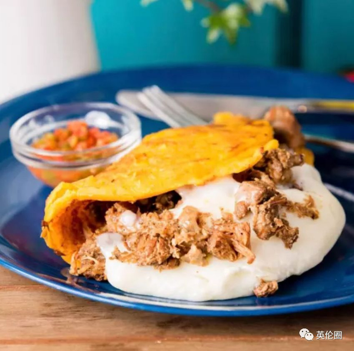 这是北美很多居民都特别爱的咸烤饼。cachapa是用新鲜的玉米打浆,调入水、奶、盐、糖等调料后,在锅上摊开烤成。委内瑞拉人酷爱甜味,所以当地的cachapa通常较甜,可以单独食用,也可配上鸡肉、火腿、芝士等食用。