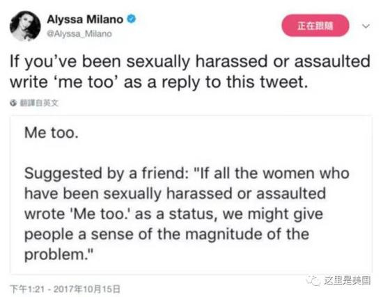 在那之后,美国女星艾丽莎•米兰诺将#Me Too 这个话题标签发到了推特上:“若你曾受到性侵犯或性骚扰,请用‘Me Too(我也是)’来回复。”