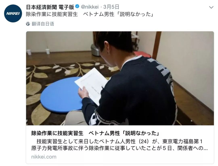 据日媒的报道,日本曾以“研修生”名义引进越南外劳,与他们签订工作内容为“建筑机械、拆除、土木”的合同,之后,却将其中一些人偷偷送到福岛,协助清理第一核电厂周围核垃圾,这名越南实习生就是其中一员。