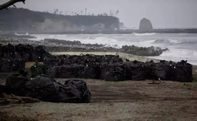 日本福岛第一核电站核灾难清理的被污染的土壤、叶子和垃圾被放入大黑塑料袋中弃置在海边。