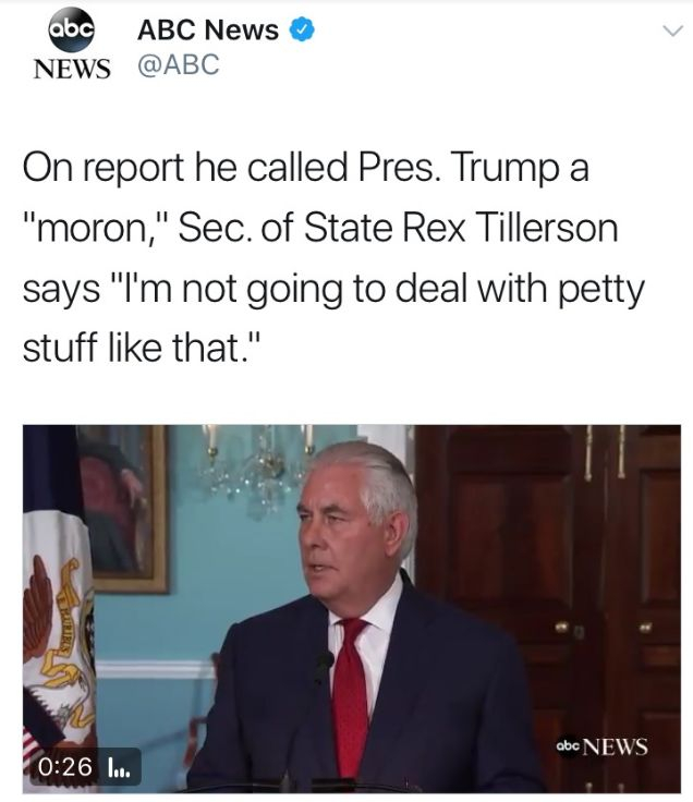 NBC新闻曾在去年10月爆料,早在2017年7月,蒂尔森就曾私下骂川普“moron”(奇葩白痴),并有辞职想法。据说在这件事上,川普从来没有原谅过他。