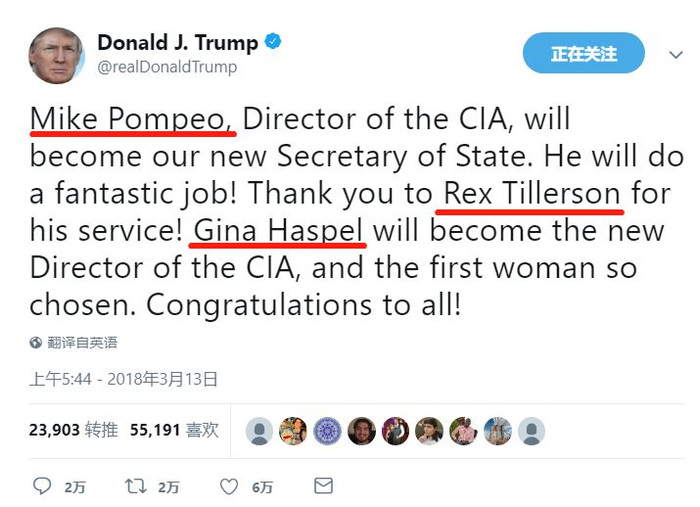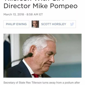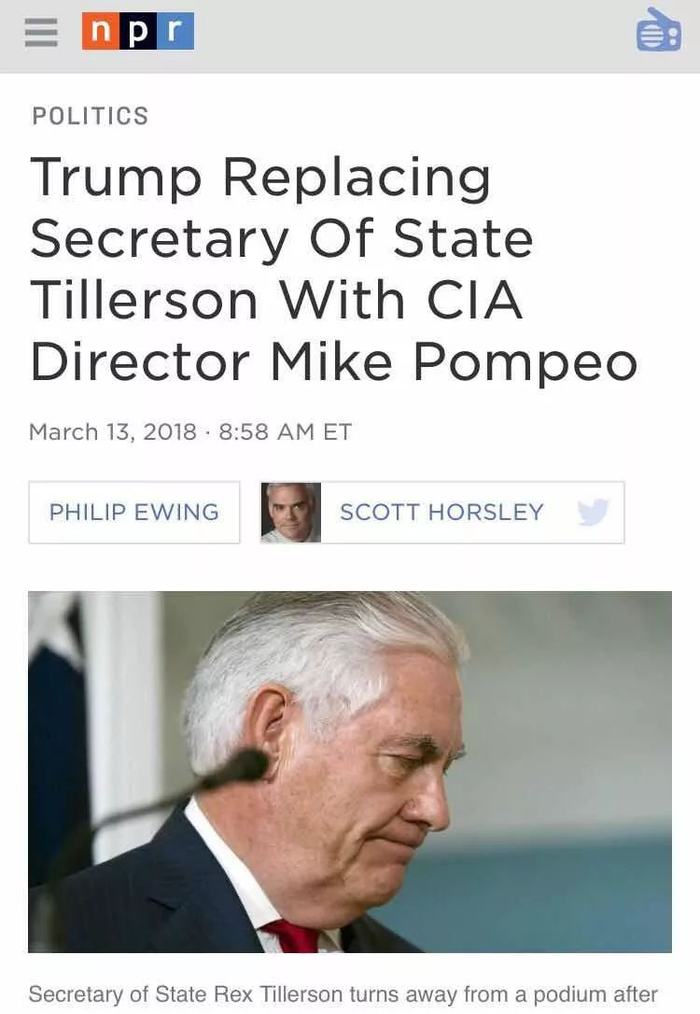 1。 川普炒掉国务卿Rex Tillerson,CIA(中央情报局)的局长Mike Pompeo被任命为新国务卿