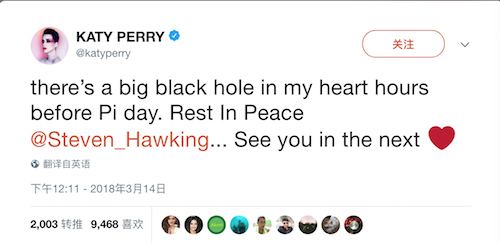 “水果姐“Katy Perry在社交媒体上称,(霍金的离世)在自己心上开了一个黑洞。愿霍金安息。
