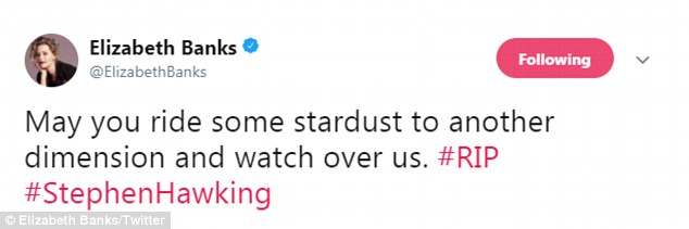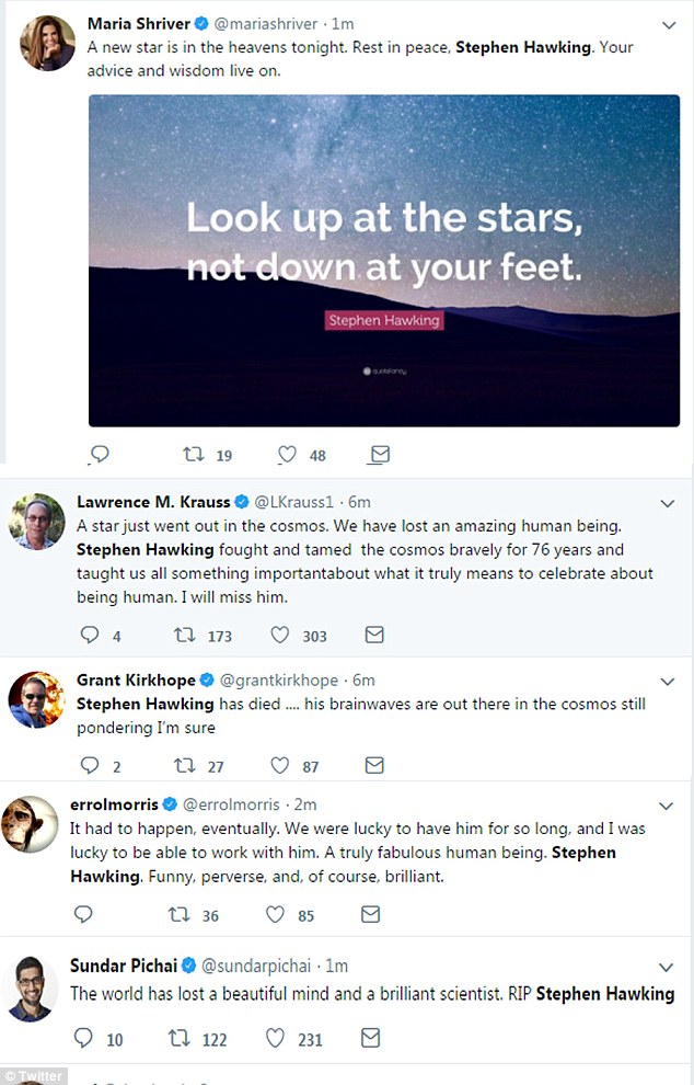 新闻主持人、施瓦辛格前妻玛丽娅·施莱弗悼念称:“今晚天堂将拥有一颗新星,愿史蒂芬·霍金安息。你的智慧将永存。” 这条推特下不少名人纷纷留言悼念。