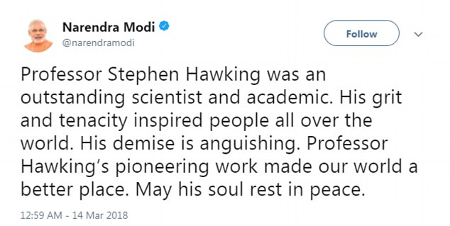 印度总理莫迪发文悼念称:“霍金教授是一名接触的科学家和学者。他的伟大和坚韧鼓舞着全世界的人们。他的离去让我们痛苦。霍金教授的先驱性工作让我们的世界变得更美好。愿他的灵魂得到安息。”