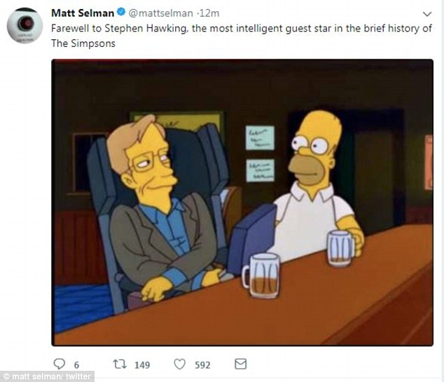 《辛普森一家》制作人Matt Selman分享了一张卡通霍金在剧中的截图,并写道:“别了史蒂芬·霍金,《辛普森一家》简史中最聪慧的客串明星。”