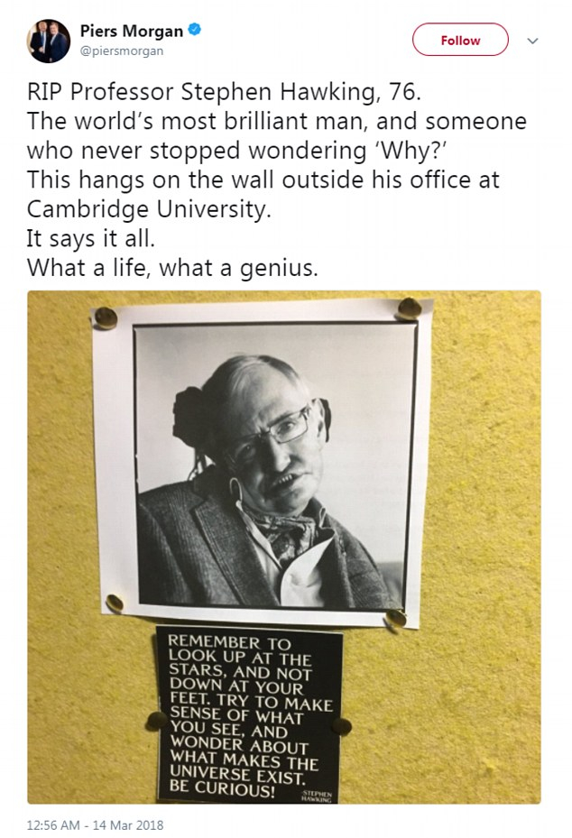 著名主持人皮尔斯·摩根发文悼念称:“愿史蒂芬·霍金教授安息,享年76岁。世界上最聪明的人,也是从未停止询问‘为什么?’的人——这句话也被挂在他剑桥大学办公室的外边。这说明了一切。无与伦比的生命,无与伦比的天才。”