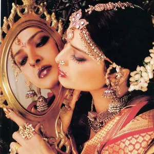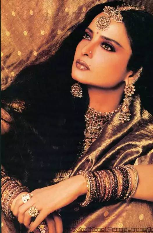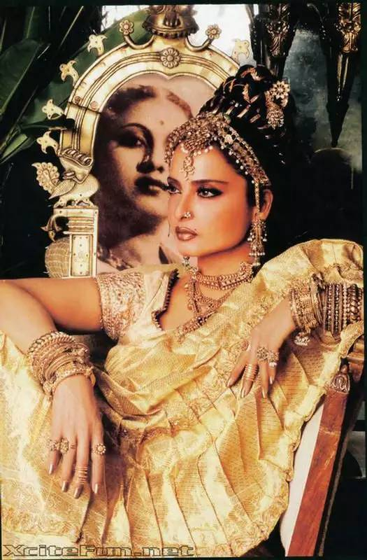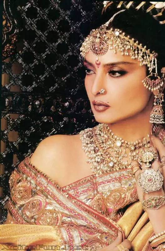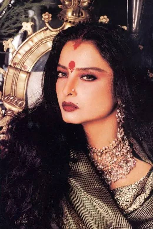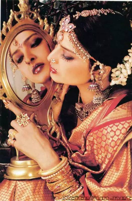 Rekha被喻为印度的嘉宝,确实有其恰当之处。古铜色的迷离深彩,珠宝佩环的璀璨光芒,仿佛流淌着古老的神话。那种与生俱来的神秘的美,让人渴望从她冷冽绝艳的眼眸深处窥探另一个世界的风云变幻,却只能遥望,只能仰视。惟“惊世骇俗”,竟再无以形容。这是一种接近神的美,她仿佛站在水镜之上俯瞰着芸芸众生,那样孤绝的骄傲,骄傲的孤独!她的身边容不下任何一个人并肩。