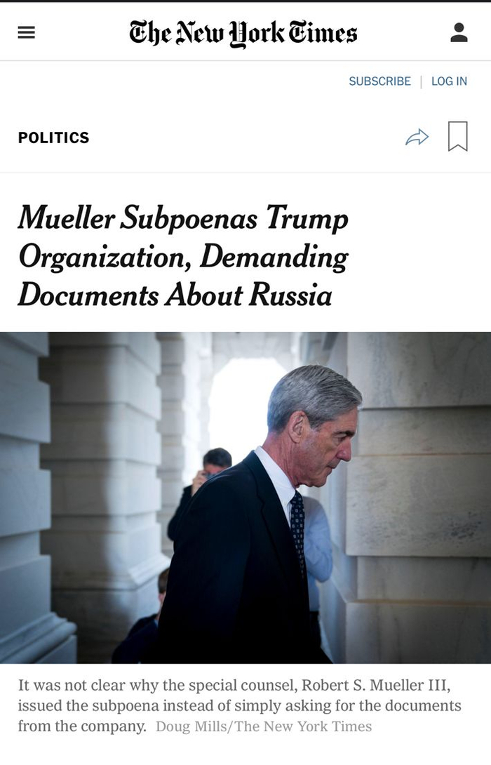 《纽约时报》率先报道特别检察官穆勒向川普公司发出传票,要求交出与俄国生意往来的文件。