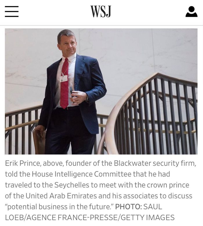 媒体在很早的时候就报道过,2017年1月,川普竞选赞助人、黑水公司(Blackwater)总裁埃里克·珀里斯(Erik Prince)在塞舌尔与普京代表、“俄罗斯直接投资基金, RDIF”运作者基里尔·德米特里耶夫(Kirill Dmitriev),以及阿联酋官员会面。