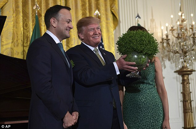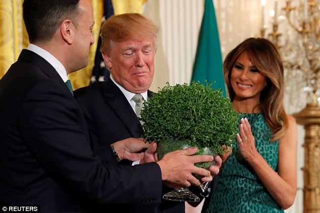 当地时间3月15日,特朗普会晤爱尔兰总理利奥·瓦拉德卡。当日正值爱尔兰圣帕特里克节,爱尔兰总理拿出一盆三叶草赠送给特朗普。