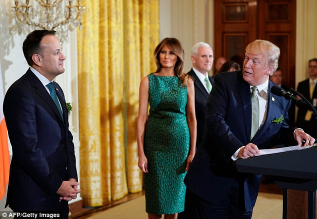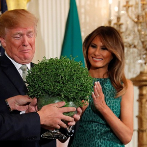下午6点,特朗普参加了爱尔兰总理三叶草的赠与仪式。赠送三叶草是爱尔兰圣帕特里克节的节日传统。特朗普抱着三叶草合影,身边的第一夫人梅拉尼娅也身着绿色长裙,绿色是圣帕特里克节的标志颜色。