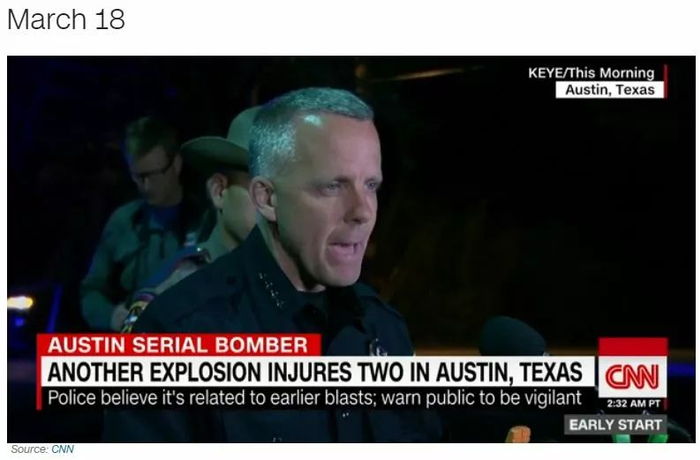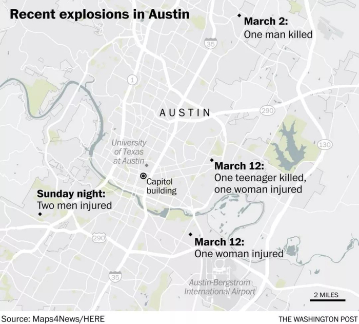 周日的爆炸发生在奥斯丁西南部,距离前三次爆炸区域发生了大的转移。发生时间在警方刚刚公布悬赏10万美金寻找破案信息的消息几小时之后。而这一次受伤的2人都是白人男性。给案情侦破增加了复杂度。所幸两人没有受到致命伤害,也有望尽快出院。但警方在接受采访中表示,目前无法排除这几起连环爆炸至少有一部分动机是针对少数族裔的仇杀。