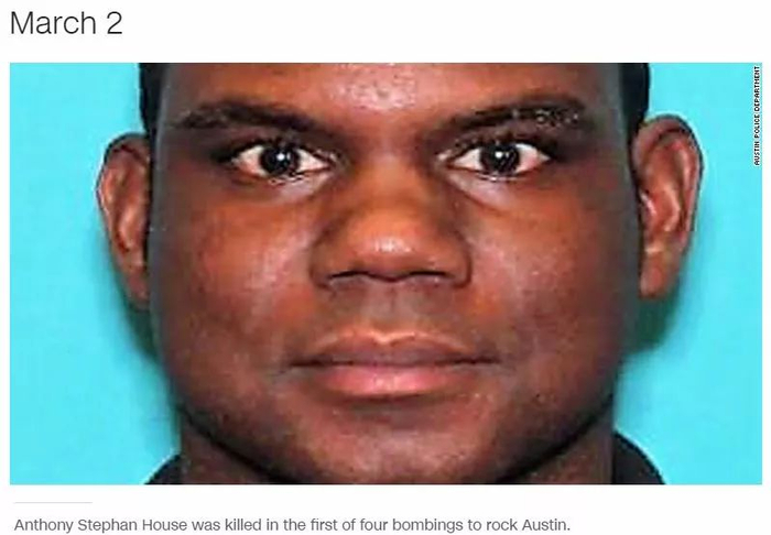最初三起爆炸案都是炸弹被伪装成包裹放置在不同居民家门口,而昨天周日发生的第四起爆炸则是炸弹在路边被引爆。这也是16天内发生的第四起恶性爆炸案件。最初2次爆炸炸死一位39岁的非裔建筑工人,和一名17岁的非裔高中生。这两名遇害者都与奥斯丁非裔社区一些领袖人物有关系。第三次爆炸严重炸伤一位75岁的西裔妇人。