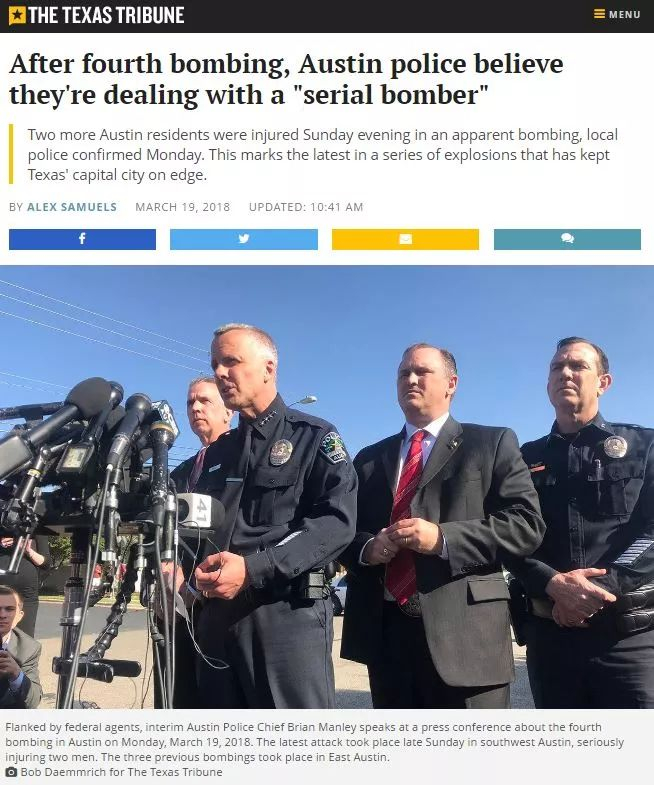 继3月13号,德州奥斯丁11天之内发生第三起同类爆炸案后,今天再度传来坏消息。昨天,奥斯丁一居民区发生第四起连环爆炸案,2名经过的骑自行车的男子受伤。