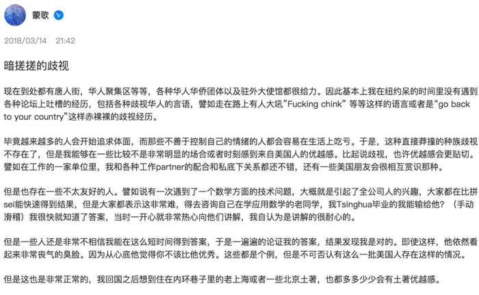 “毕竟越来越多的人会开始追求体面,而那些不善于控制自己的情绪的人都会容易在生活上吃亏。于是,这种直接莽撞的种族歧视不存在了,但是我能够在一些比较不是非常明显的场合或者时刻感到来自美国人的优越感。