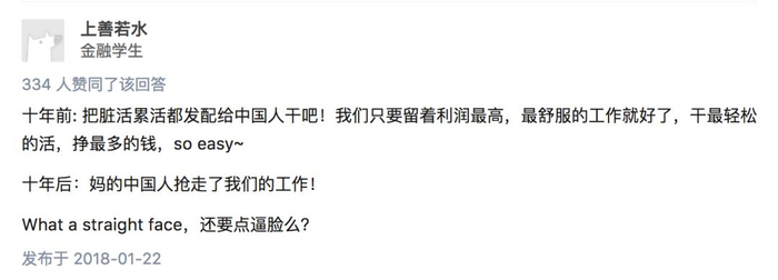 但是一些人还是非常不相信我能在这么短时间得到答案,于是一遍遍的论证我的答案,结果发现我是对的。即使这样,他依然看起来非常丧气的臭脸。因为从心底他觉得你不该比他优秀。这些都是个例,但是不可否认有这么一批美国人存在这样的情况。