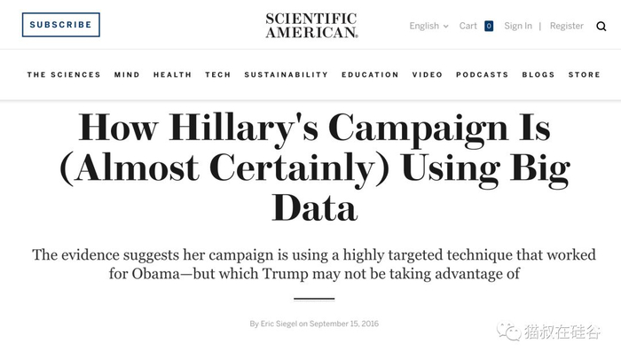 2016年9月,美国知名科普期刊《科学美国人》撰文预测希拉里必将赢得大选,文章大标题是《希拉里团队是如何(几乎肯定)使用大数据的》,小标题则是“证据显示,希拉里团队正在使用奥巴马曾经行之有效的一种极具针对性的(拉票)手段,而这是特朗普团队所无法比拟的。”