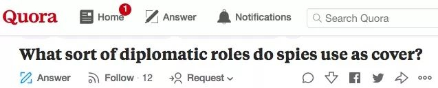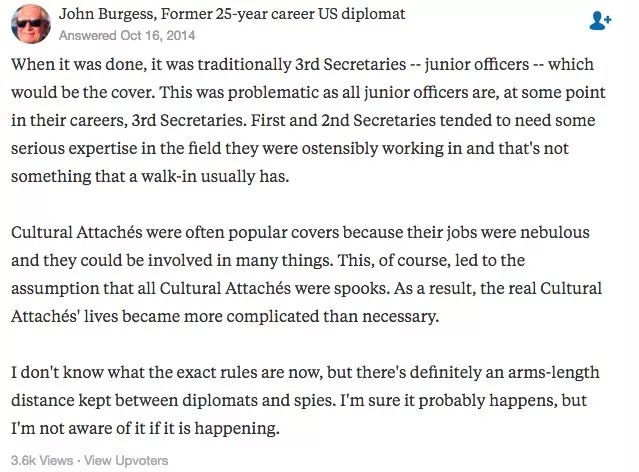 在问答论坛Quora上,有人提问:“间谍会使用什么外交角色作掩护?”