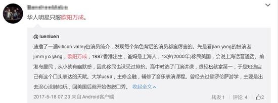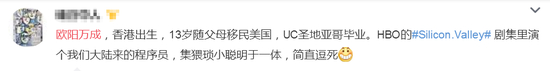 HBO大受欢迎的美剧《硅谷》(Silicon Valley)播出后,饰演Jian Yang一角的欧阳万成知名度暴涨,走在路上也常常听到有人小声议论,“他是不是Jian Yang”。