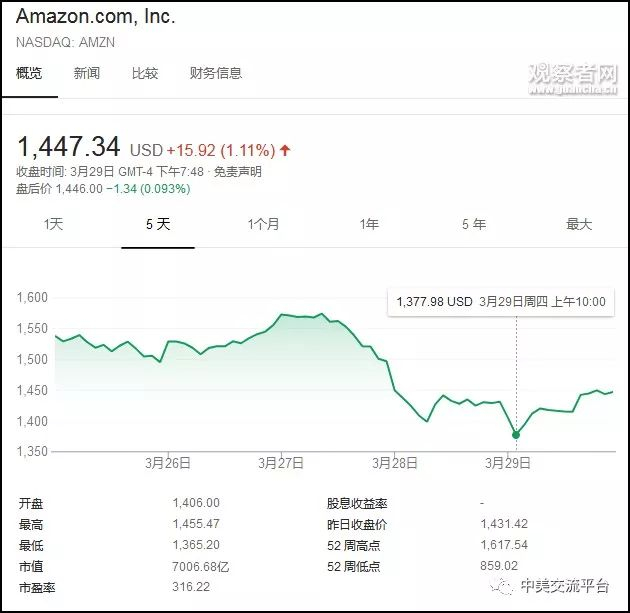 3月26日,亚马逊的市值还有7530亿美元;到了3月29日就只剩7000亿美元。而京东美股在29日收盘时的市值为576.85亿美元。换言之,亚马逊差不多在五天之内跌掉了一个京东。