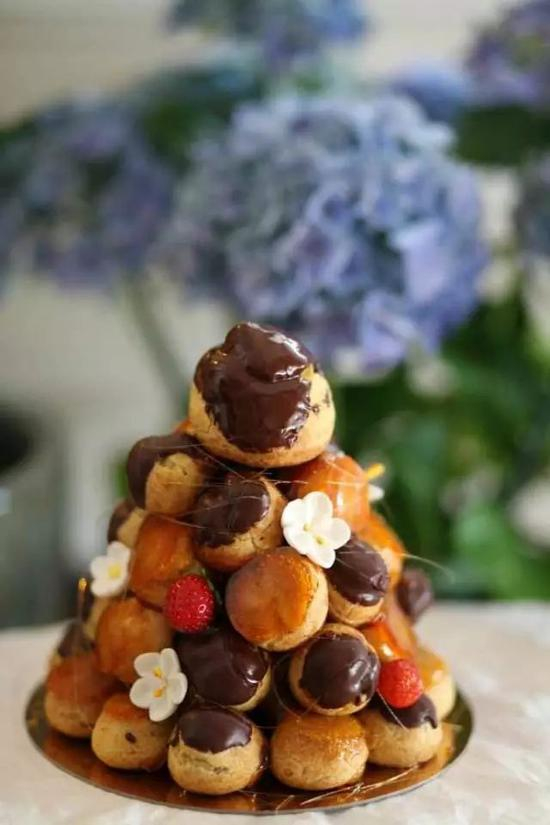 传说奶油和蛋糕结婚了,便有了奶油蛋糕,面包从此失恋了,它把对奶油的爱深深藏进了心底,于是有了泡芙。泡芙塔是法国传统的庆祝甜点,象征着幸福的泡芙被一个一个累积起来,高高的泡芙塔就是人们对满满的幸福的憧憬。