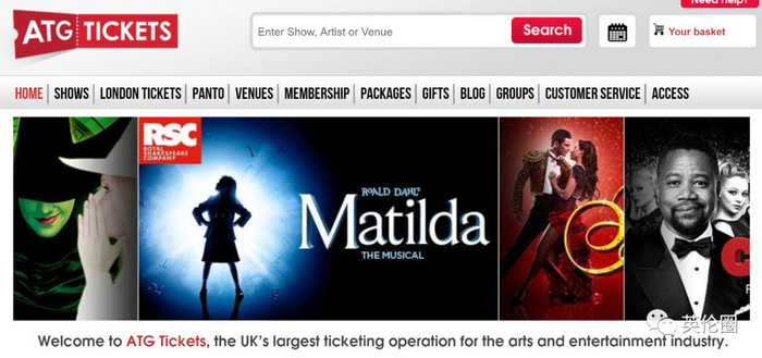 ATG是专门出售全英各个剧目演出门票的网站。音乐剧、歌剧、戏剧、喜剧、哑剧等等都可以在这里找到。