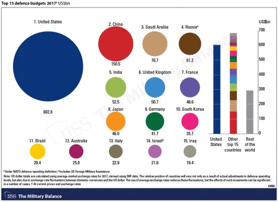 2017年全球军费开支排行,紧随美中,沙特“纯靠买”跻身前三。 来源:IISS