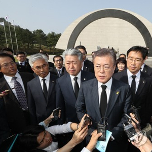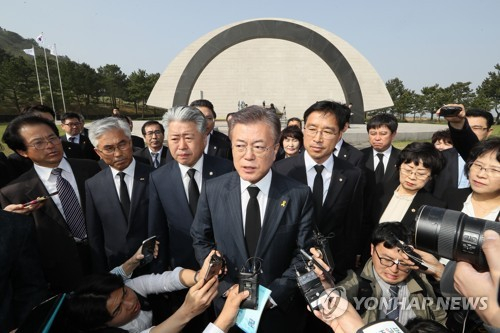 (2017年4月18日,当时作为总统候选人的文在寅前往济州4·3和平公园参拜后接受媒体采访。据韩联社。)