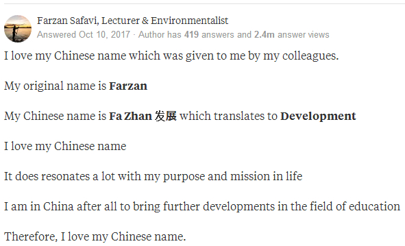 我原名叫Farzan,所以我的中文名就是“发展”了。