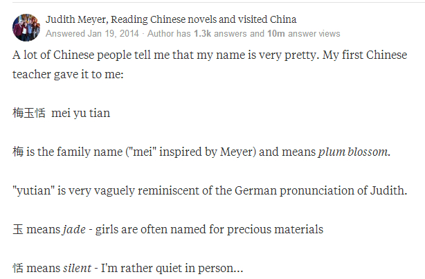 不少中国人都告诉我,我的名字很美。是我的启蒙中文老师起的:梅玉恬。