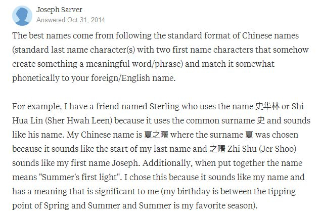 打个比方,我有个叫Sterling的朋友,他起的中文名是史华林,因为名字里的姓氏“史”是个常见姓,听起来也很像他的名字。我的中文名是夏之曙,姓夏是因为听起来挺像我自己姓氏的开头(Sarver),而之曙听起来像我的名字Joseph。还有,这个姓名合起来的意思是“夏天的第一道光”。我起这个名儿是因为它读起来很像我的名字,而且对我来说有重要意义(我的生日在春夏之交,夏天是我最喜欢的季节)。