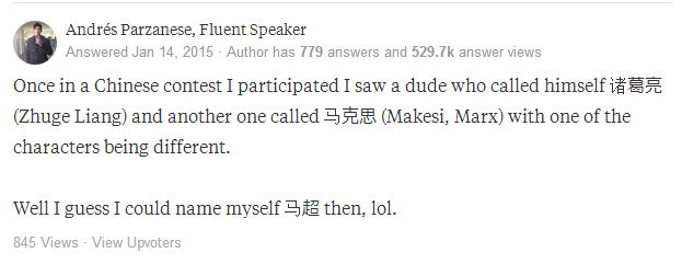 一次我参加一场中文比赛,有个哥们叫“诸葛亮”,还有个叫“马克思”,不过其中一个字的写法不一样。