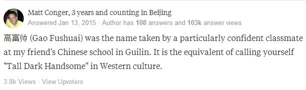我在桂林的中文学校里,有一个特别自信的同学给自己起名叫“高富帅”。在西方文化中,这相当于叫自己“高大威猛招人爱”。