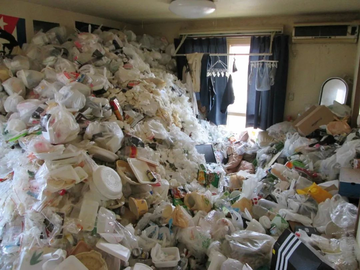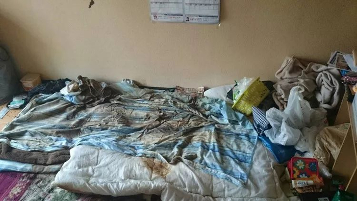 在东京东久留米市的一个单间公寓,用便利店跟超市塑料袋堆起来的垃圾山,几乎盖住了房间一半的窗户。住户是40岁的男性,被食品袋跟杂志之类的垃圾埋在下面,气绝而亡。另外,在东京江东区的单间公寓里,褥子周围堆满了脏兮兮的锅跟酒瓶子,已故的50岁男性睡过的褥子上面,留着粘稠发黑的深色液体。