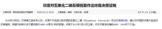 据印度报业托拉斯4月8日报道称,根据印度消费税和海关中央委员会的通知,对从中国进口的五氧化二磷征收反倾销税,征收期为五年。