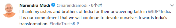 莫迪在当天的推特中写到,党内成员(Karyakartas)是印度人民党的全部,也是该党的灵魂与核心。非常感谢党内兄弟姐妹们对BJP的支持。印度人民党将继续秉持初心,继续推动印度转型。