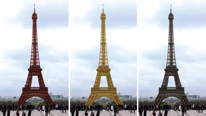 但埃菲尔铁塔最初,也就是1889年,它其实是被漆成红色的,而且从底部到上部还由深变浅。