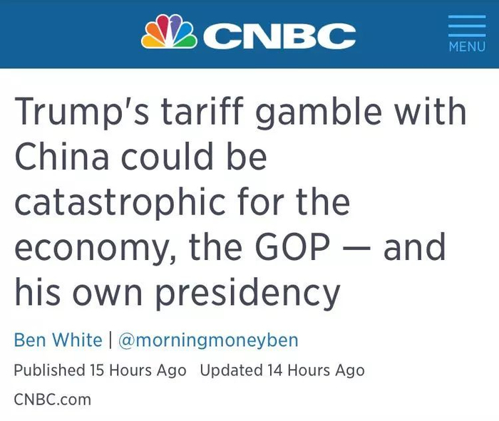 CNBC也评论称,这场“贸易战”是特朗普置一切于不顾的赌博。
