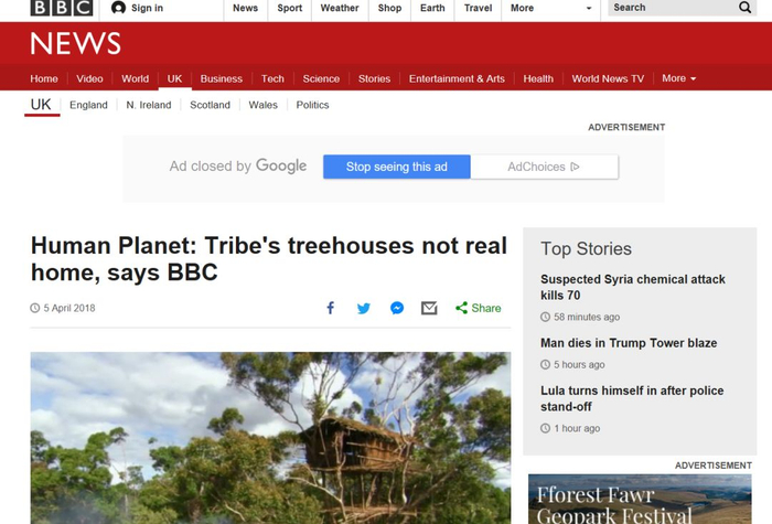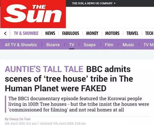 首先,BBC承认了这件事:”我们已经重新看过《人类星球》中对当地人习俗的描写,我们发现部落搬到树屋居住的情节是不准确的。”