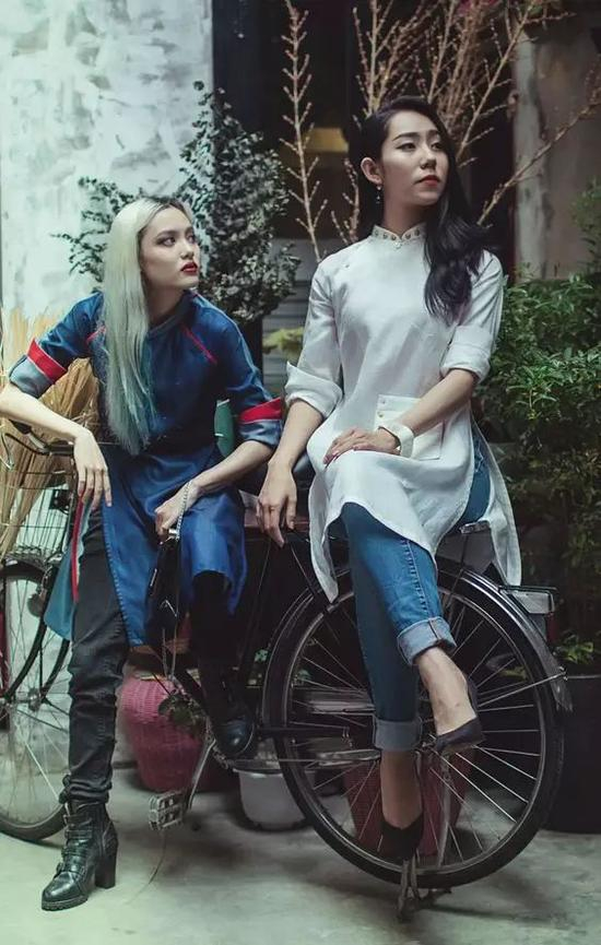 奥黛与牛仔裤的碰撞,古典与现代的融合,美得很简约。