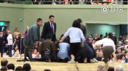 但是这个时候,场地内的广播居然对这两名女观众说道:“请上台的女观众马上下去,男性观众请登台(帮忙)。”因为女性接触相扑土俵是日本的禁忌,据现场市民透露,该广播至少三次重复播放了该句话。