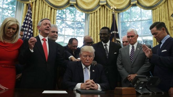 牧师称,川普挑选内阁部长的时候,“将参加过我们众议院和参议院学习班的那些人任命为部长”,副总统彭斯“知道哪些人是坚定的信徒”。