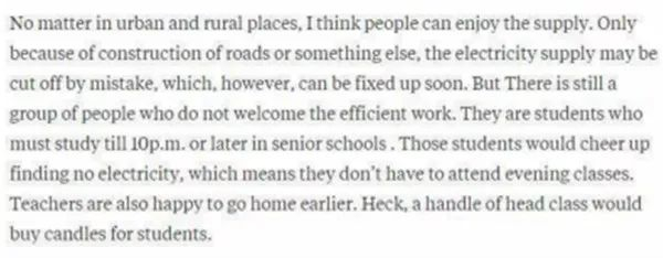 “无论在城乡,我都觉得人们能享受这个供应。只有因为修路或其他原因,电力供应才可能会被错误地切断,然而,这很快就会被修复。但是有一群人不喜欢这么有效率的复电。他们是要学习到(晚上)十点或更晚的学生。 这些学生会因为没有电而感到高兴,这意味着他们不必上晚课,老师也乐意早点回家。哎呀,班长会为学生买蜡烛。