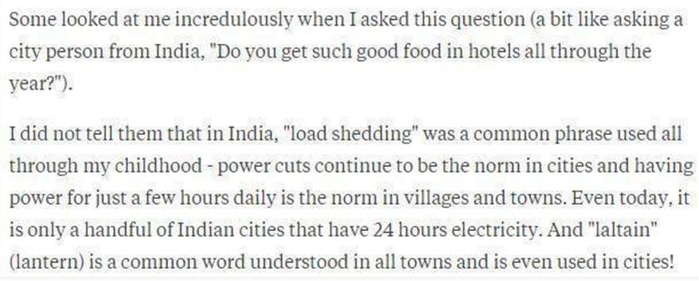 “当我问这个问题时,有些人怀疑地看着我(有点像问印度的城里人:‘你一年到头都会在酒店里得到这么好的食物吗?’)。我没有告诉他们,在印度,‘限制负荷’是我童年时常用的一个词,断电仍然是城市的常态,每天只有几个小时的电力供应是乡镇的常态。 灯笼对于乡镇的人来说是一个再寻常不过的词了,甚至城里人都在用。