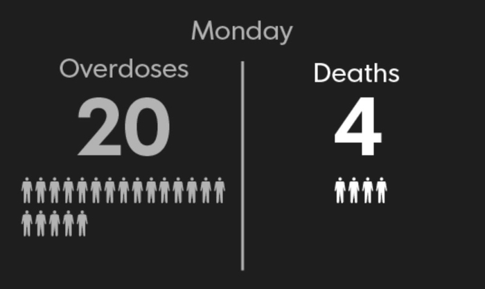 周一 20人摄入过量毒品,4人死亡